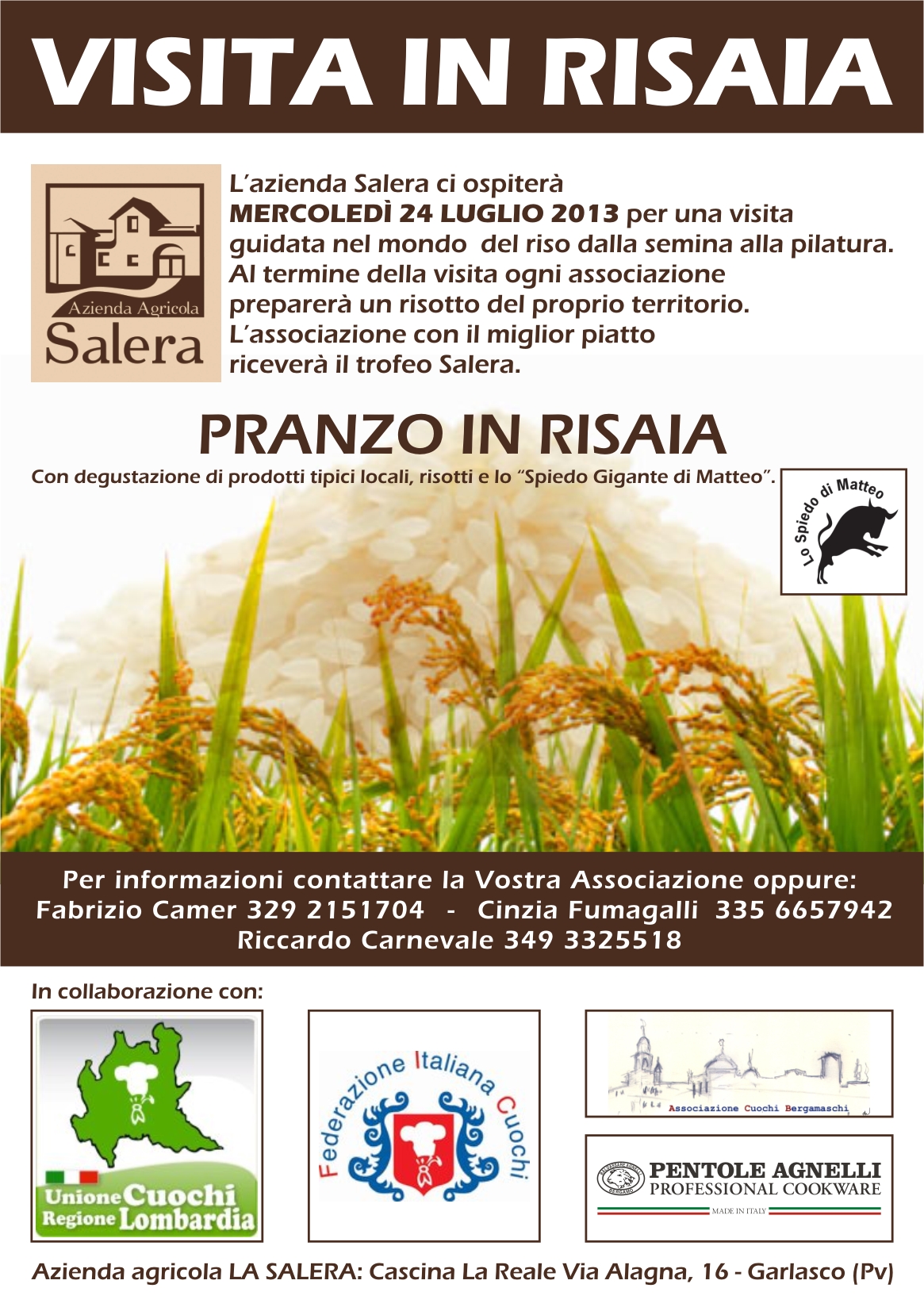 Mercoledì 24 luglio l'azienda Salera ospiterà le associazioni provinciali lombarde dei cuochi per una visita guidata nel mondo del riso, dalla semina alla pilatura. Al termine della visita ogni associazione parteciperà ad una piccola competizione amatoriale sul riso: ogni provincia proporrà un riso del territorio ( 1 kg) e verrà giudicato da cinque giudici.