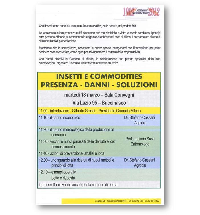 La Granaria di Milano propone un incontro dedicato alla presenza degli insetti nelle derrate. Martedì 18 marzo alle ore 11,00 presso la sala convegni dell'Associazione Granaria si terrà l'incontro "Insetti e commodities: presenza - danni soluzioni". Il seminario è ad ingresso libero, valido anche per la riunione di borsa.