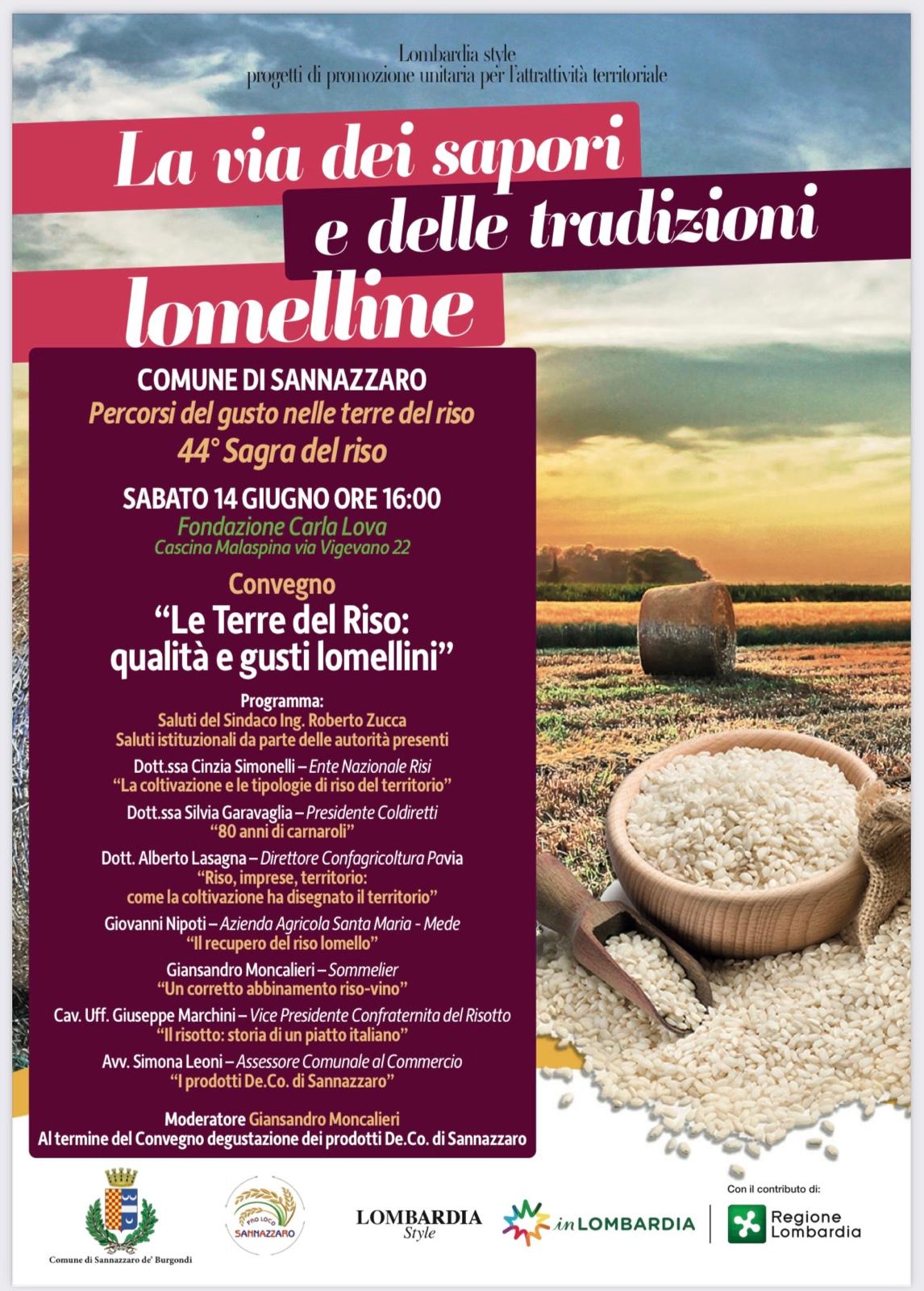 Il convegno "Le terre del Riso: qualità e gusti lomellini" si terrà sabato 14 alle ore 16 presso la Fondazione Carla Lova - Cascina Malaspina Via Vigevano, n. 22 nel comune di Sannazzaro. Tra i relatori anche la dott.ssa Cinzia Simonelli con un intervento dedicato alla coltivazione e alle tipologie di riso del territorio.