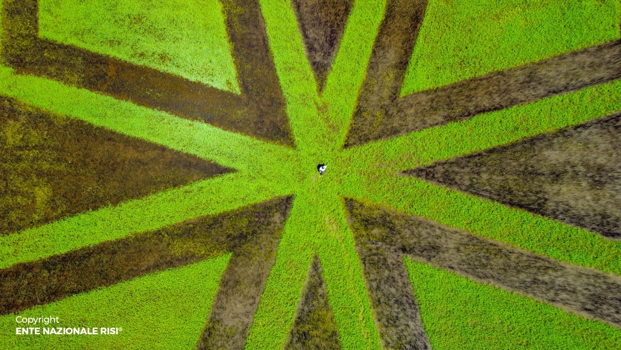 Nel 90° anniversario della propria istituzione, l'Ente Nazionale Risi ha voluto omaggiare il mondo del riso attraverso la complessa realizzazione di un disegno di riso in campo, appunto un Risegno.