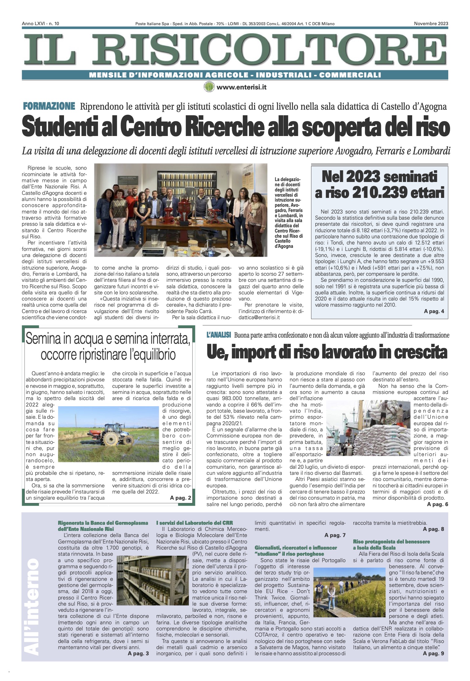 In primo piano nel numero di Novembre 2023 la visita di una delegazione di docenti degli istituti vercellesi di istruzione superiore Avogadro, Ferraris e Lombardi ed il quantitativo di Ettari seminati a Riso nel 2023: 210.239