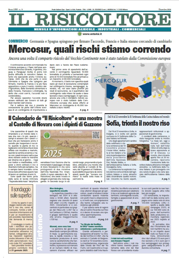 In primo piano nel numero di Dicembre 2024 i rischi per la risicoltura europea del controverso accordo tra UE e i paesi dell'area Mercosur e l'evento dedicato al riso italiano che si è svolto a Sofia, capitale della Bulgaria che ha visto la presenza della Presidente Bobba e della Ambasciatore Zarra.