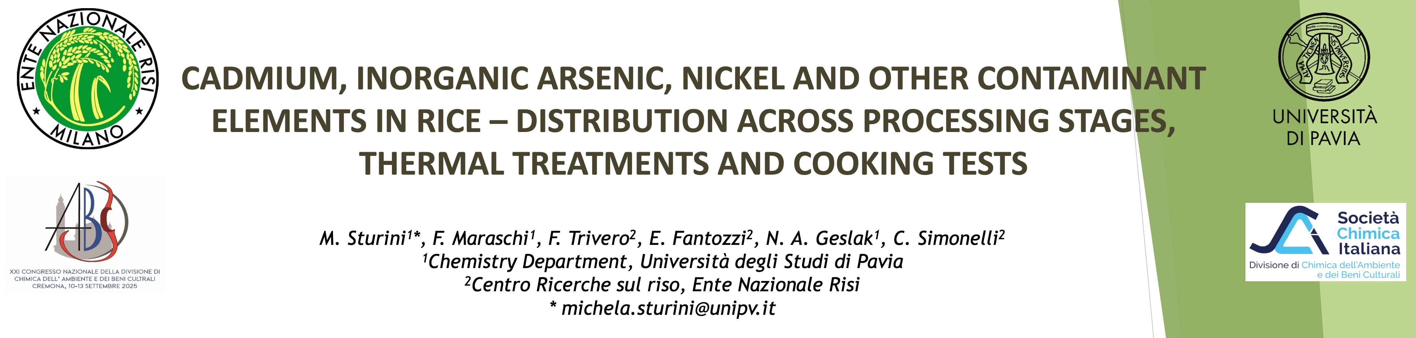 Il Laboratorio di Chimica Merceologia e Biologia Molecolare ha partecipato al XXI Congresso Nazionale della Divisione di Chimica dell’Ambente e dei Beni Culturali, tenutosi a Cremona il 10-13 settembre 2025 presentando un Poster scientifico dal titolo: “CADMIUM, INORGANIC ARSENIC, NICKEL AND OTHER CONTAMINANT ELEMENTS IN RICE – DISTRIBUTION ACROSS PROCESSING STAGES, THERMAL TREATMENTS AND COOKING TESTS”.