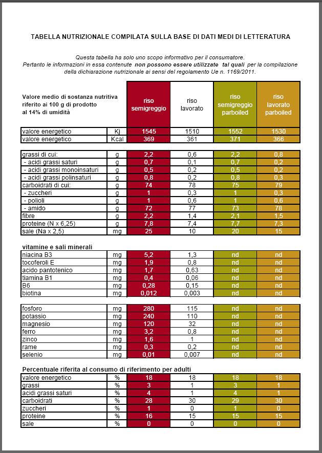 Dati nutrizionali Riso