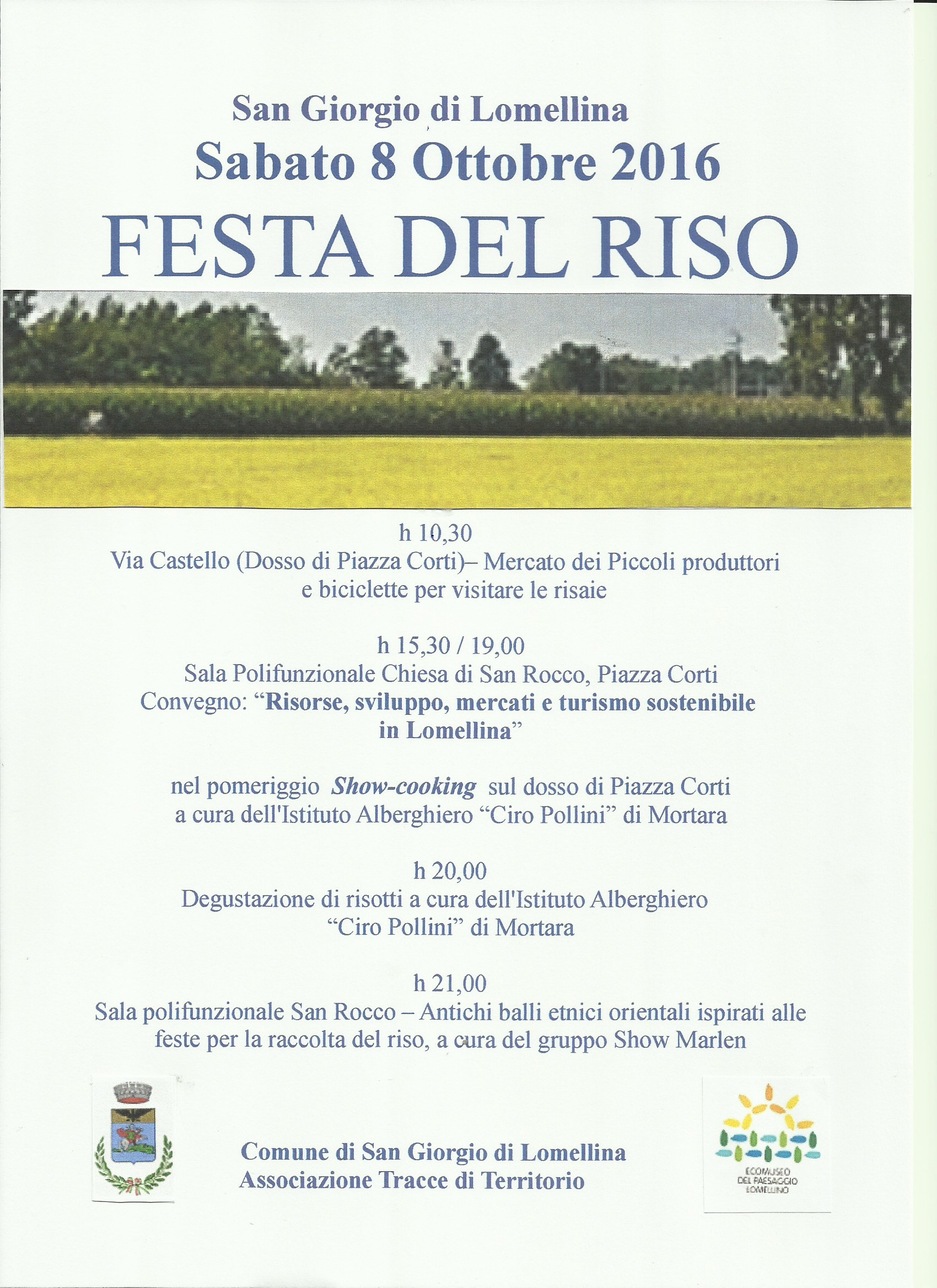 L'Associazione Tracce di Territorio organizza due giornate dedicate al riso: sabato 8 ottobre l'evento clou sarà il convegno "Risorse, sviluppo, mercati e turismo sostenibile nelle zone delle risaie della Lomellina". Il dott. Sciorati, dell'Ente Nazionale Risi, presenterà la relazione "La coltivazione del riso in Lombardia attraverso i secoli".
