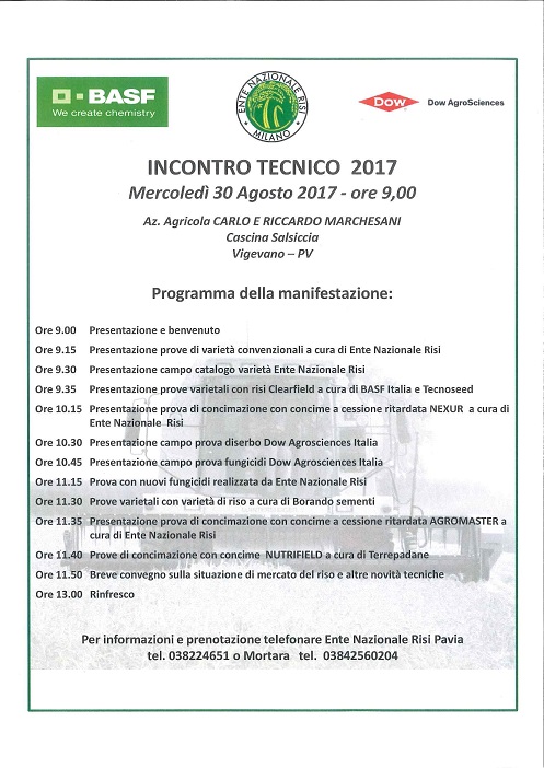 Appuntamento mercoledì 30 agosto alle ore 9,00 presso la cascina Salsiccia di Vigevano (PV) con la visita alle prove in campo. In programma prove varietali, concimi, diserbi e fungicidi.