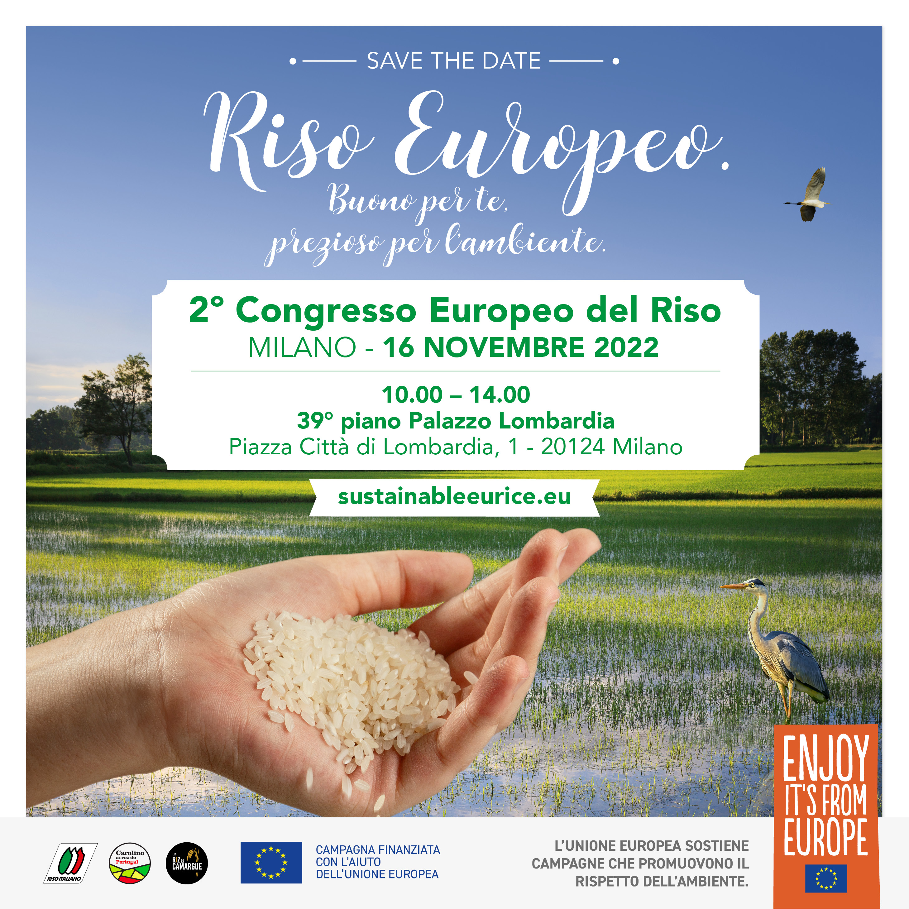 Mercoledì 16 novembre si terrà il secondo Congresso Europeo del riso, appuntamento che si inserisce all’interno del progetto di ampio respiro Sustainable EU Rice – Don’t Think Twice, volto a promuovere e valorizzare il riso made in EU e a diffondere consapevolezza sulle tecniche di coltivazione che ne garantiscono la qualità, nel rispetto dell’ambiente e nel segno della tracciabilità e salubrità.