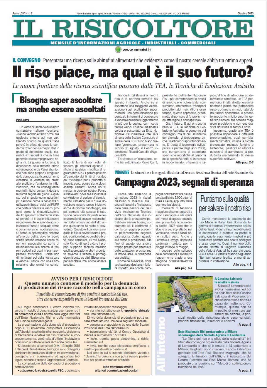 Pubblicato on-line "Il Risicoltore" di Ottobre 2023